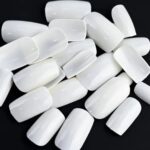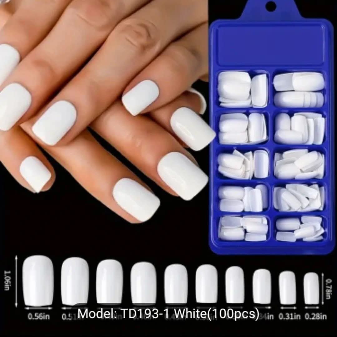 100pcs Coffin Press On Nails Set. High-quality white and clear false nail tips in the popular coffin shape. Durable, easy to apply, and available in 10 sizes—perfect for DIY manicures, nail extensions, and professional nail art designs.