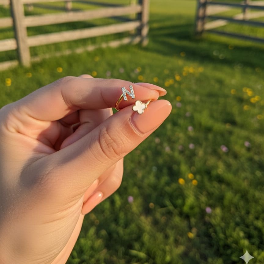 This elegant, adjustable ring features a sparkling, personalized initial paired with a classic four-leaf clover motif for a touch of luck.