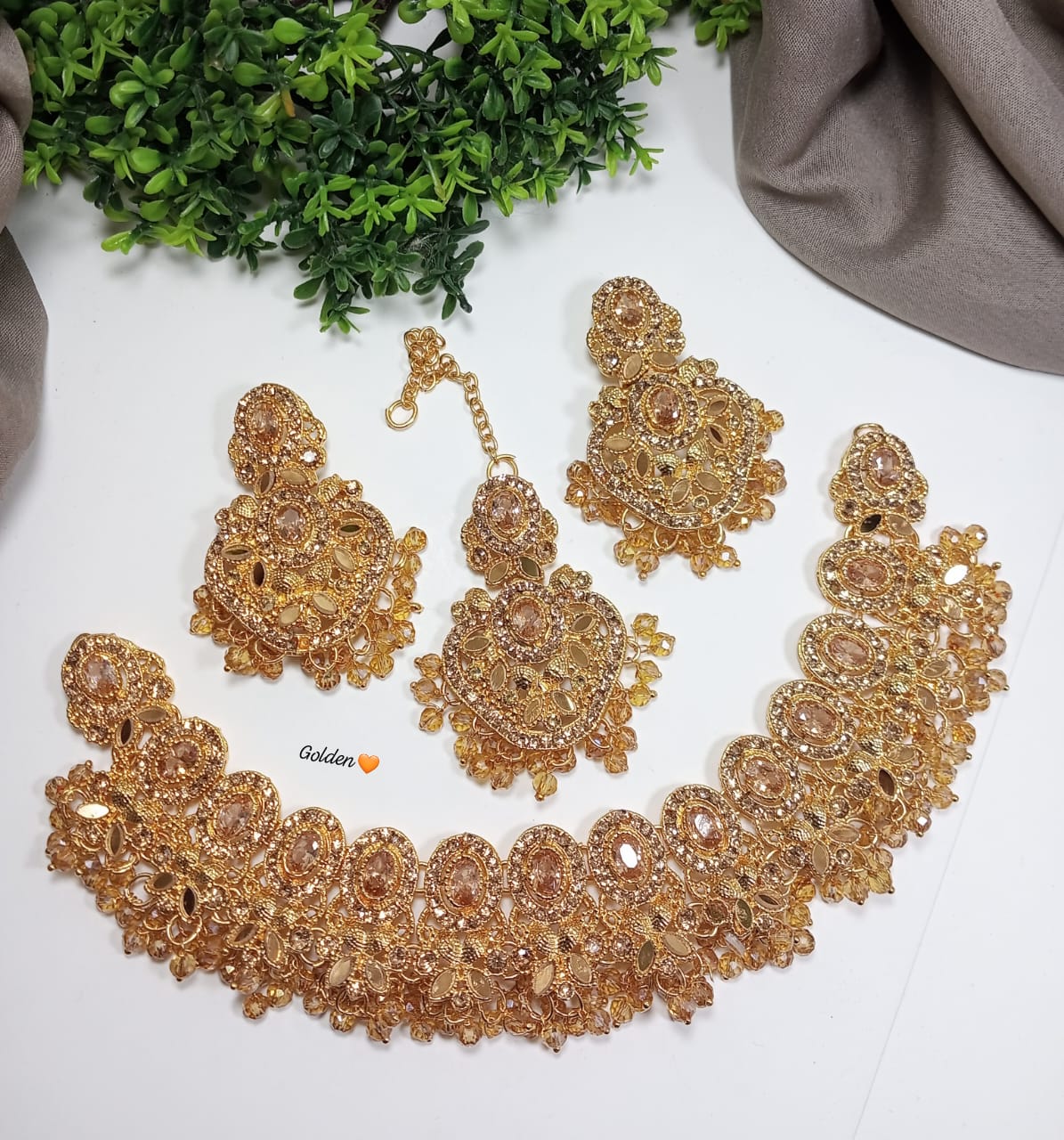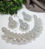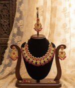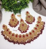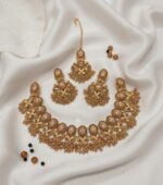 The necklace sits gracefully as a choker or collar, detailed with delicate beadwork and stone clusters. The accompanying earrings are designed to perfectly echo the necklace’s motif, completing the look with majestic flair. This set is the ultimate statement piece for weddings, festivals, and high-end ceremonial occasions, instantly transforming any outfit into a royal spectacle.