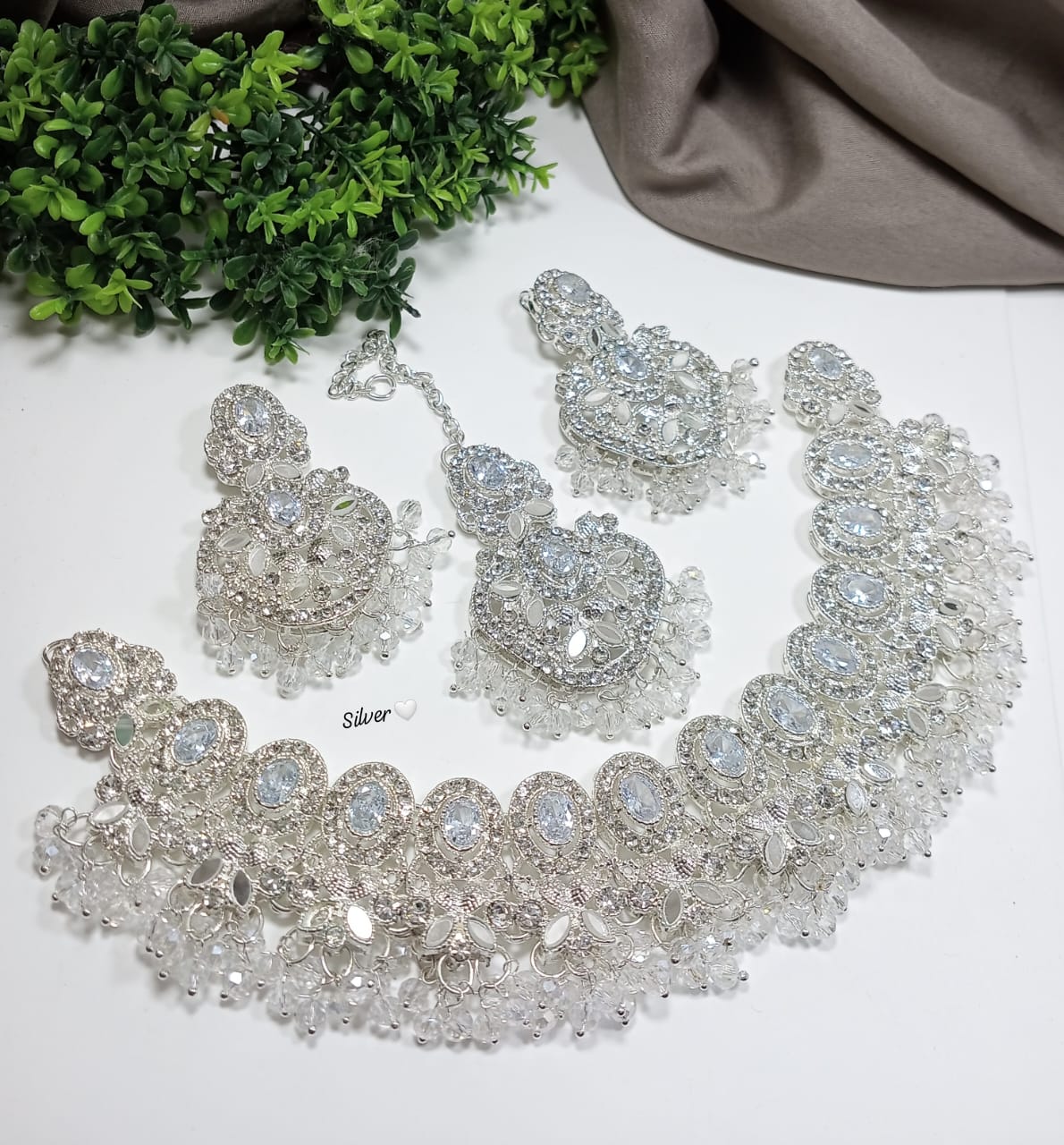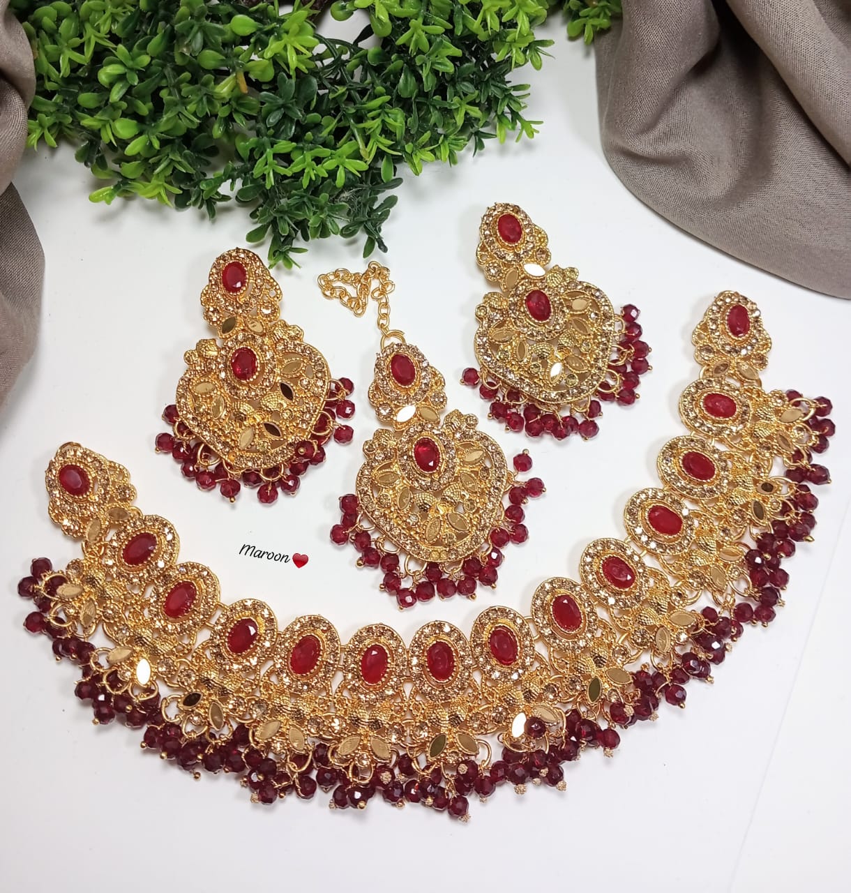 Embrace the grandeur of Indian royalty with this magnificent Rajwadi Stone Necklace Set. This three-piece ensemble is a testament to traditional artistry, featuring a breathtaking necklace, coordinating drop earrings, and a matching bindia/maang tikka.