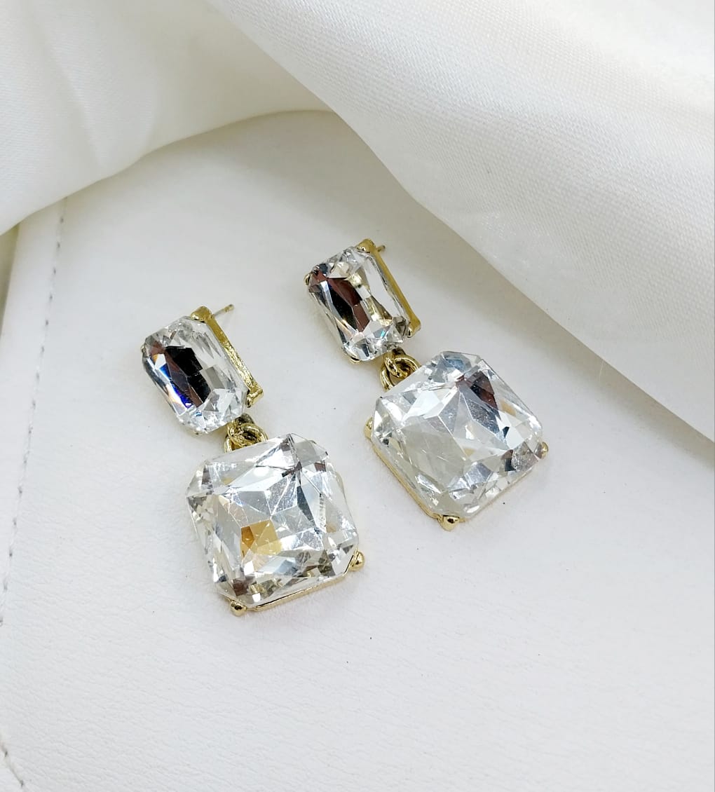 Shine with effortless elegance! These striking drop earrings feature brilliant rectangular crystals, set in a captivating two-tiered design. Perfect for adding a sophisticated touch and vibrant sparkle to any look.