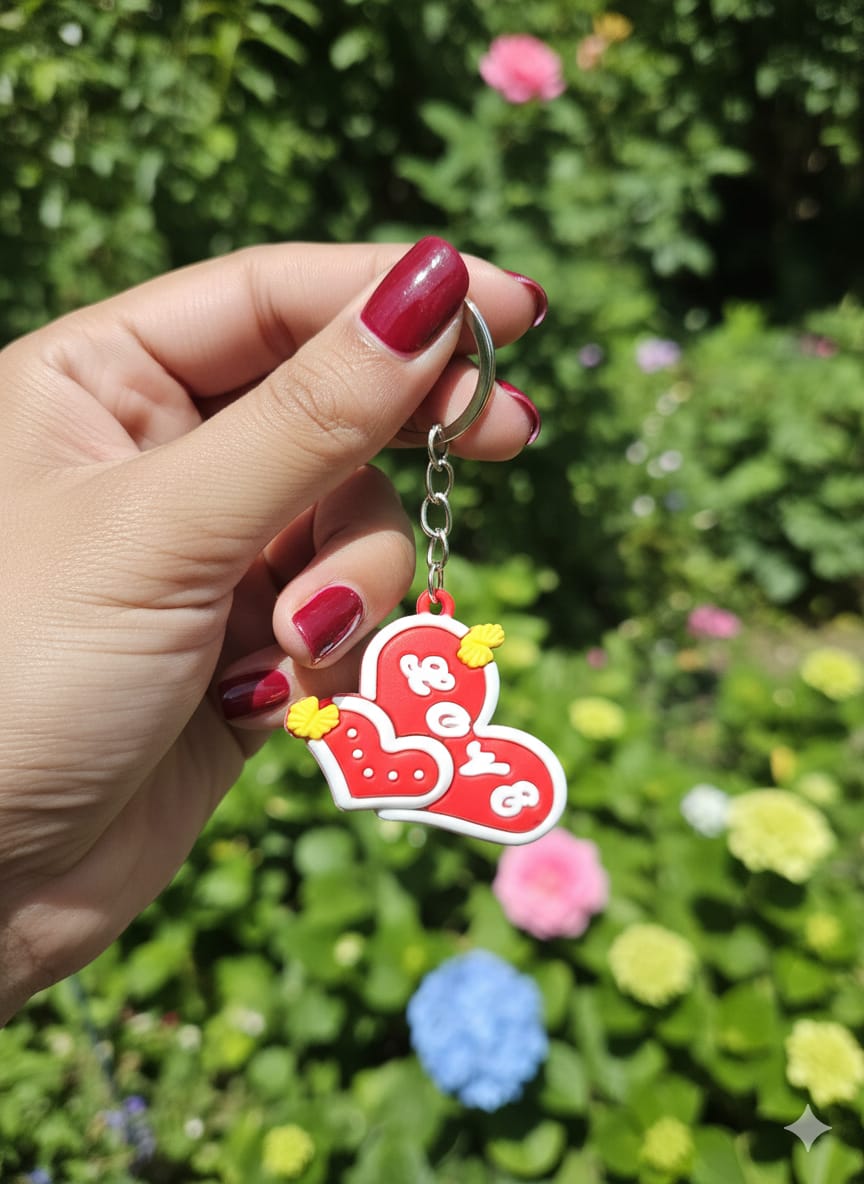 Good Luck Wish Heart Charm Rubber Keychain. A durable silicone rubber heart charm conveying a good luck message. Perfect thoughtful gift or positive-vibe accessory for keys and bags.