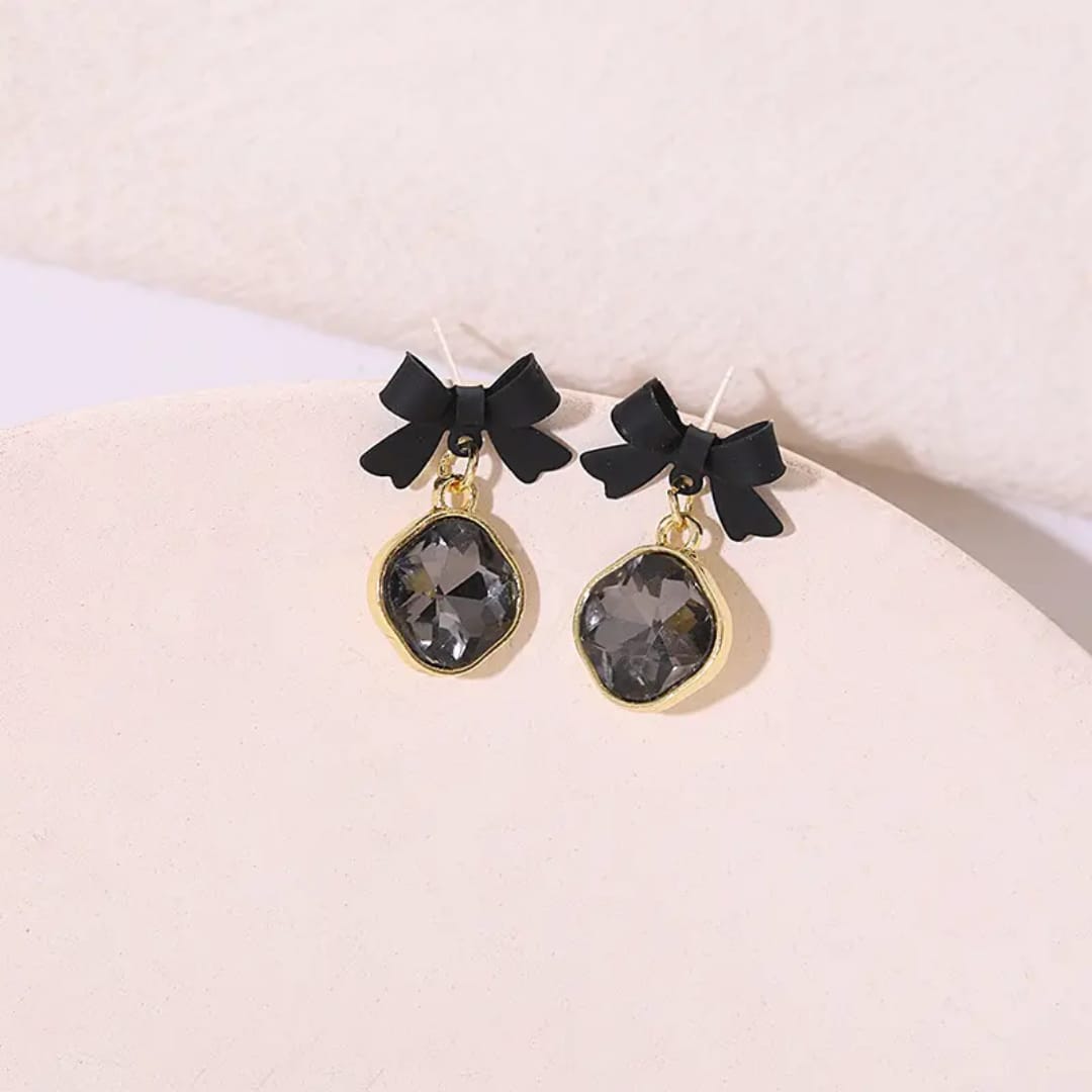 Design & Style: The earrings feature a prominent, structured black bow, often crafted from plush velvet or smooth enamel, offering a rich textural contrast. Suspended beneath the bow is a breathtaking drop composed of bright, multifaceted crystals. This combination creates a beautiful contrast between the dramatic dark tone and the brilliant sparkle.