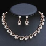 A breathtaking gold-tone necklace and matching earring set featuring a delicate vine motif, accented with luminous pearls and sparkling crystals. Ideal for weddings and formal events.