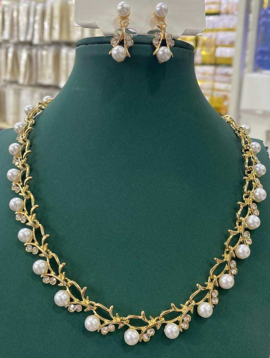 Elevate your special occasion look with the Regal Golden Vine Pearl & Crystal Set. This stunning collection includes a statement necklace and complementary drop earrings, crafted in a rich gold tone finish. The necklace is designed with an exquisite, intricate vine motif, where delicate branches gently entwine along the neckline. This ethereal pattern is beautifully embellished with luminous imitation pearls and scattered with brilliant, clear crystals for a touch of magnificent sparkle. Its nature-inspired elegance makes it the perfect accessory for brides, bridesmaids, proms, or any significant formal event where you want to make a truly unforgettable impression.