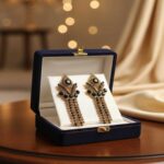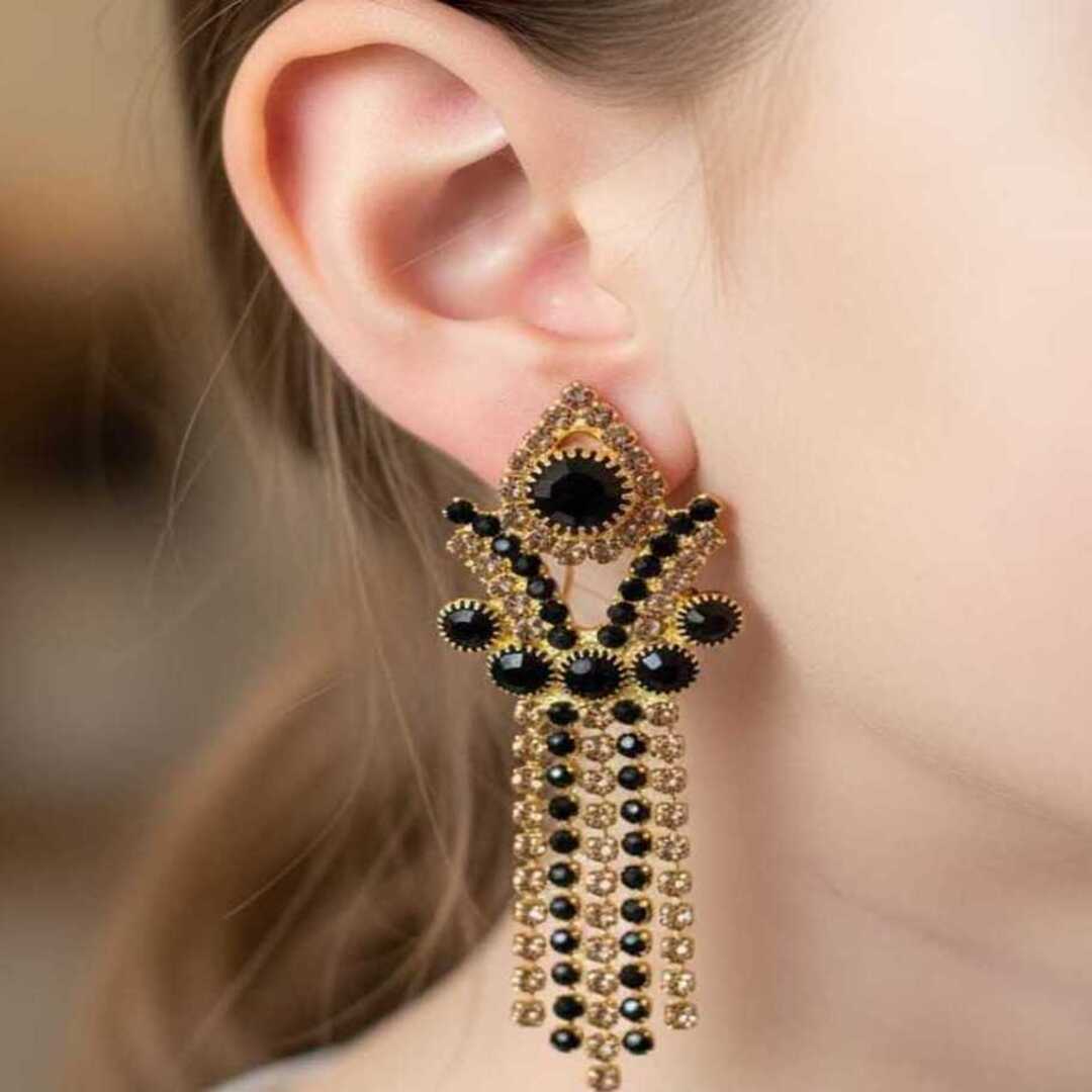 Exquisite black stone and gold-toned dangle earrings, perfect for a touch of regal sophistication.