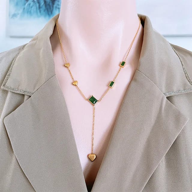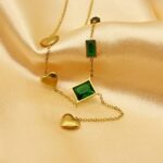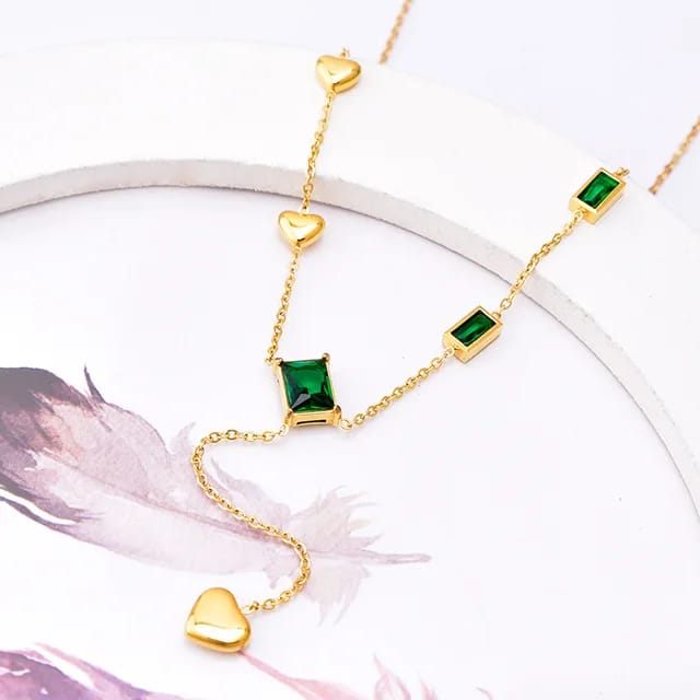 Modern necklace contrasting polished heart charms with striking geometric simulated gemstones on a fine chain