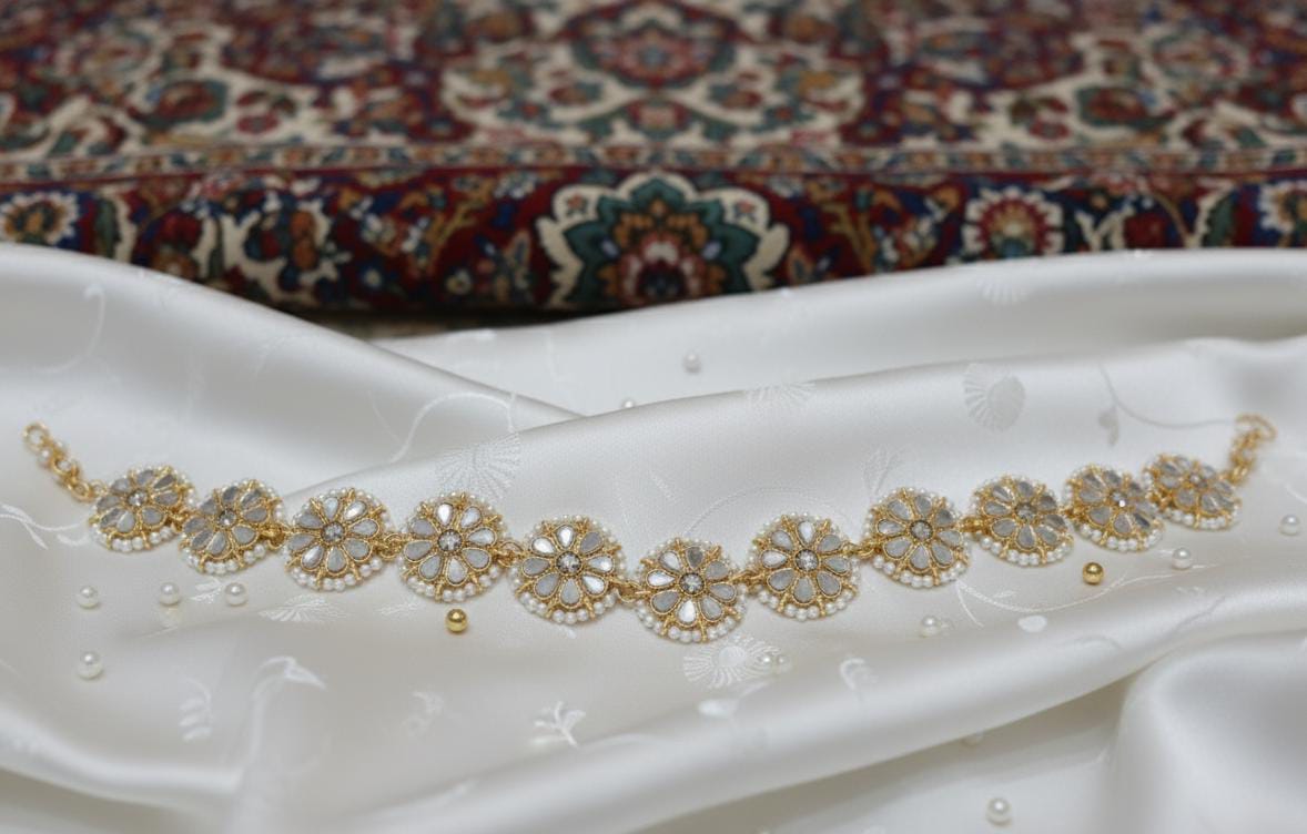 The Mathapatti is designed to run along the hairline, featuring a central focal point that rests gracefully on the forehead. This central piece is connected to elaborate chains that extend to the sides and anchor securely into the hair. The intricate metalwork (often in an antique gold tone) is typically adorned with shimmering Kundan, crystal, or bead embellishments, alongside delicate pearl drops that sway with movement.