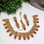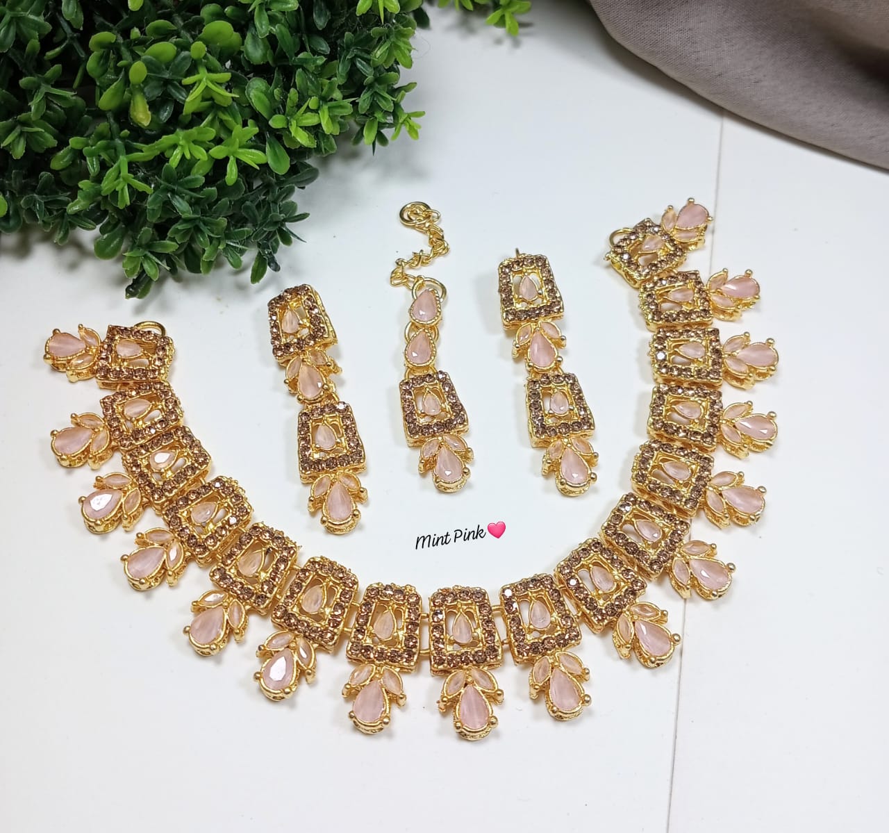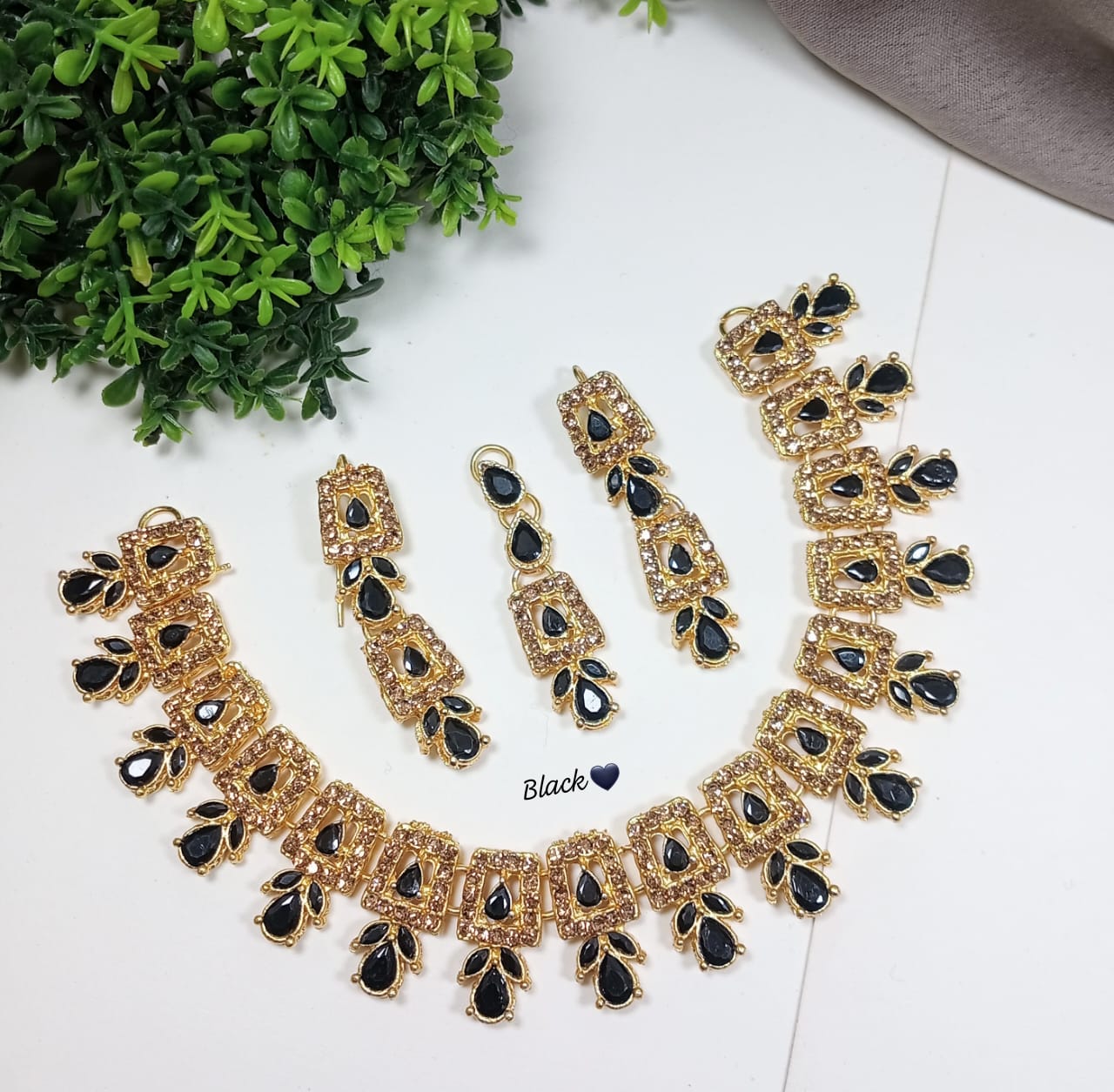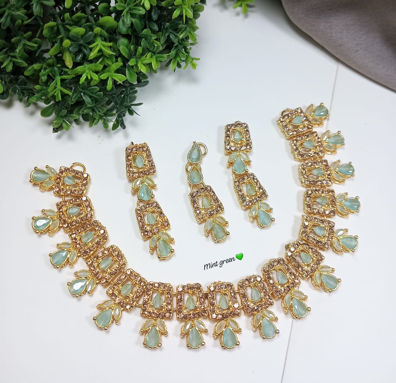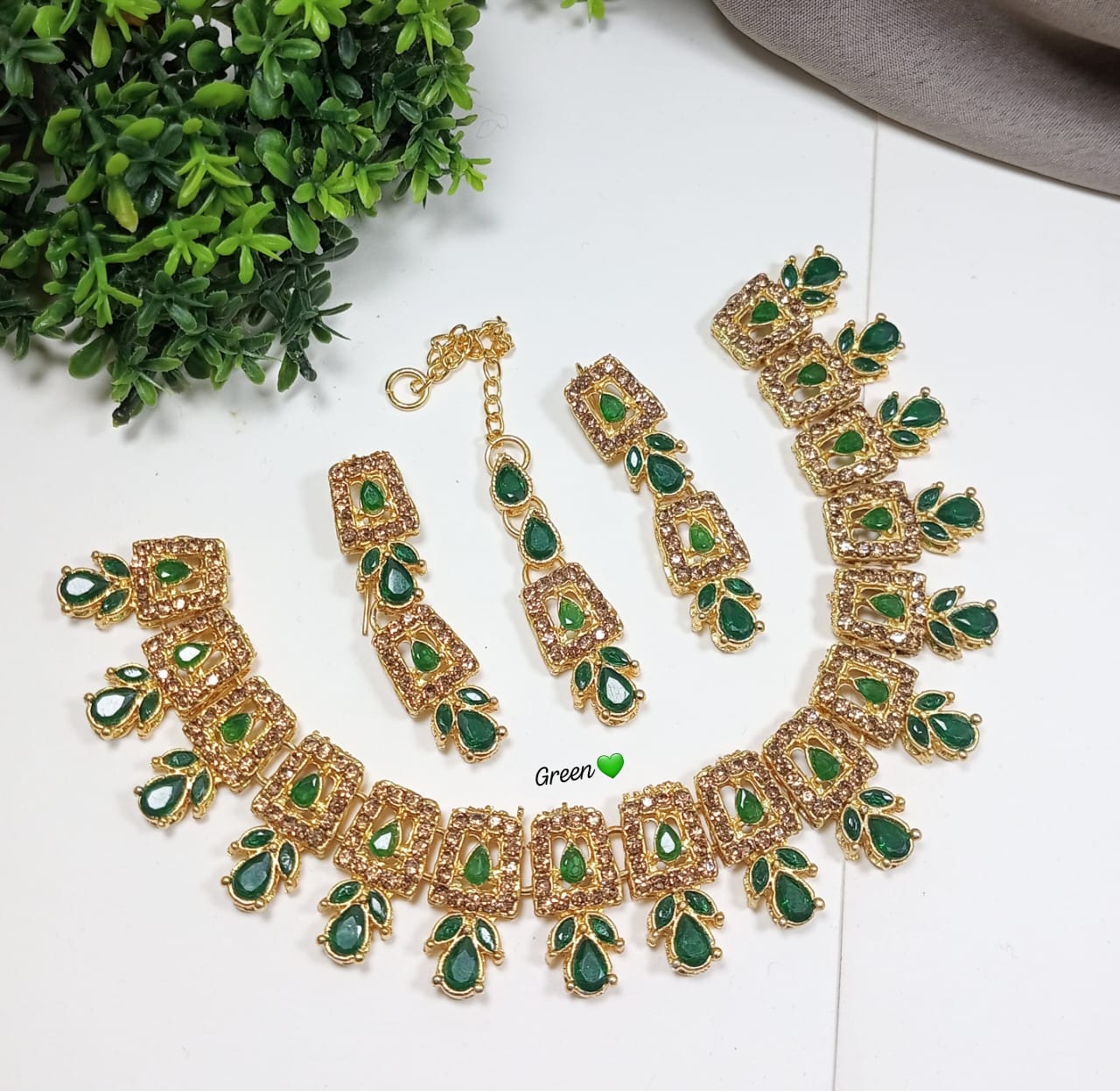 Magnificent full set (necklace, earrings, teeka) featuring brilliant Zircon stones in a traditional, luxurious design perfect for grand occasions